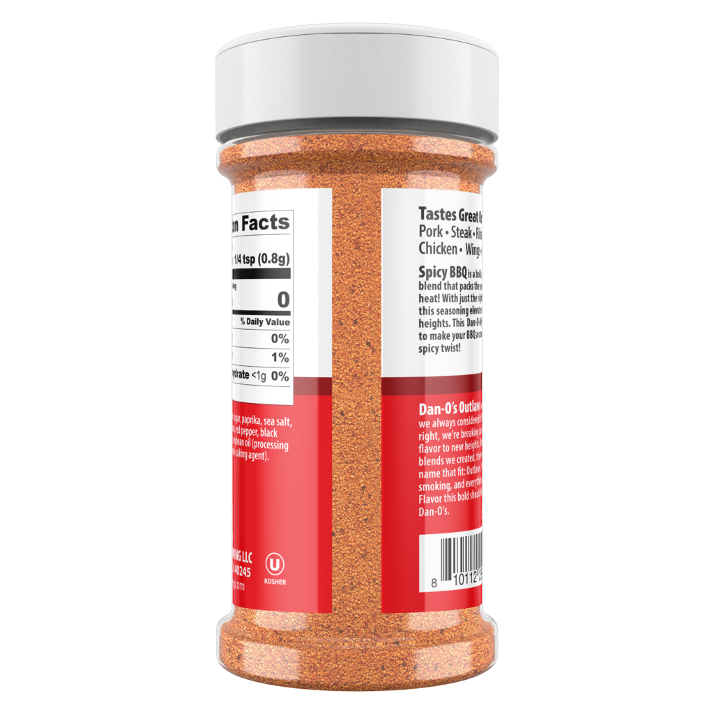Dan-O’s® Outlaw Spicy BBQ brings the heat to your grill with a bold fusion of smoky sweetness and just the right kick of spice. This Dan-O-Myte® blend takes traditional BBQ seasoning and cranks it up a notch, with a sweet heat that continues to build, complemented by dried garlic and onion. It’s the kind of flavor that grabs attention, keeps ‘em coming back for seconds, and makes every bite unforgettable. Whether you’re firing up ribs, steak, or even salmon, this Spicy BBQ blend adds a perfectly balanced punch that transforms everyday meals into bold, craveable BBQ masterpieces.