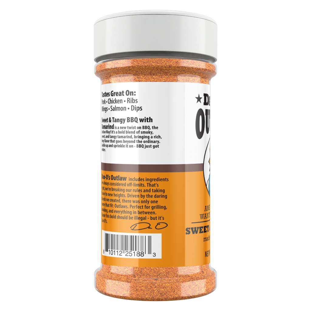 Dan-O’s Outlaw Sweet & Tangy BBQ Made With Tamarind is a smoky blend with warm chili peppers, a slight black pepper burn, and a tangy and slightly sweet finish.