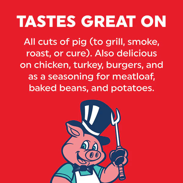 All cuts of pig (to grill, smoke, roast, or cure). Also delicious on chicken, turkey, burgers, and as a seasoning for meatloaf, baked beans, and potatoes.