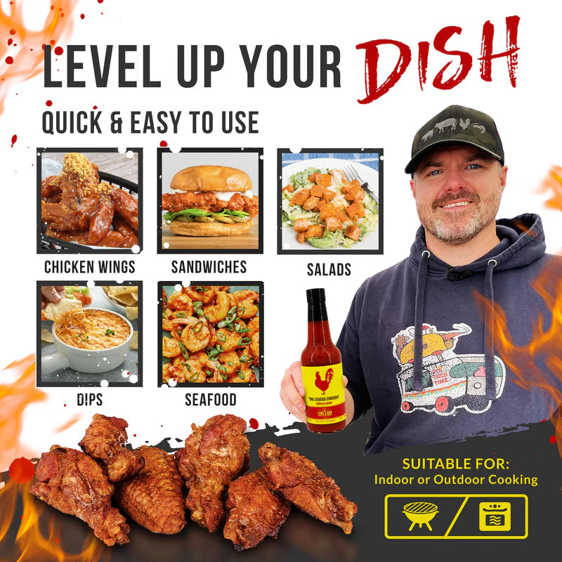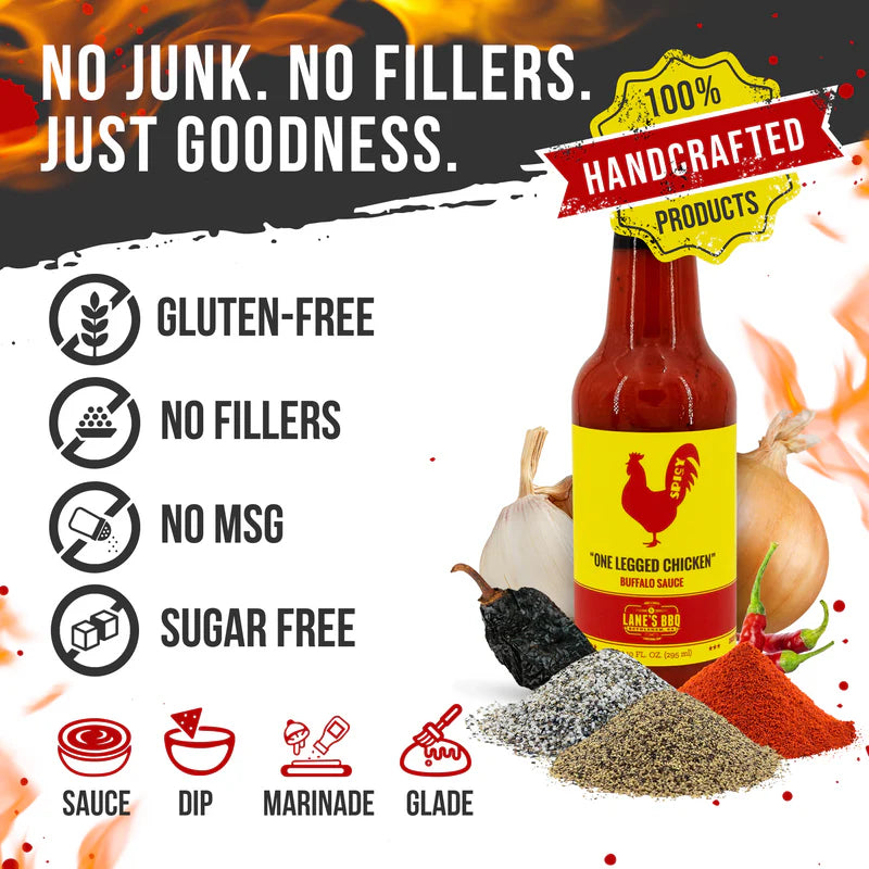 Lane's BBQ One-Legged Chicken Buffalo Sauce The ultimate sauce to bring the heat and flavor of Buffalo wings to your table. Crafted with a perfect balance of zesty cayenne pepper, tangy vinegar, and savory spices, this sauce delivers a fiery kick that will satisfy even the boldest taste buds. For only having one leg, this sauce kicks hard! Its smooth and velvety texture clings to chicken wings, creating a mouthwatering coating that packs a punch of flavor in every bite. Whether you're grilling, baking, or frying, this versatile sauce is perfect for creating the authentic Buffalo wing experience right in your own kitchen. With Lane's BBQ One-Legged Chicken Buffalo Sauce, you'll transform ordinary chicken into a fiery and irresistible delight that will have everyone reaching for more. Get ready to spice up your meals and elevate your wings to a whole new level of deliciousness.